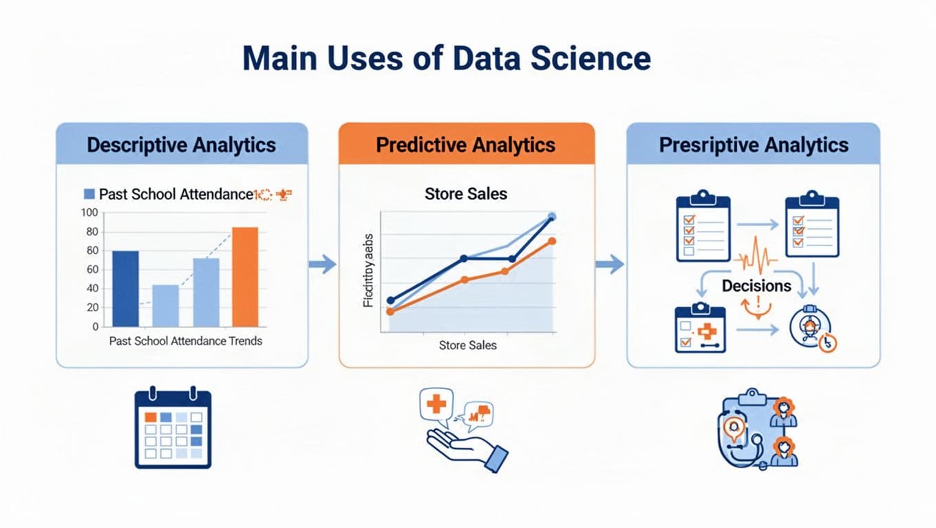 Data science turns raw data into practical answers for decisions. Its three main uses are descriptive (what happened), predictive (what will happen), and prescriptive (what to do next). Most projects follow the same 5 stages of data science: define the question, gather data, clean it, explore and model, then test and use the result.